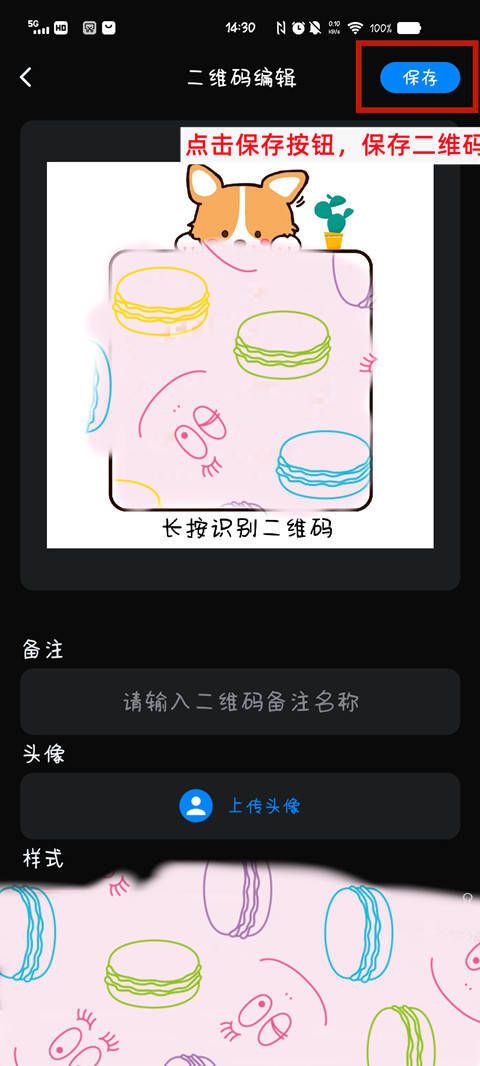 第四步 提取二维码之后,我们可以对二维码进行编辑,下方有着各式各样的二维码样式,点击选择,同时还可以上传头像和添加备注。编辑好的二维码我们可以直接将其保存到手机相册。