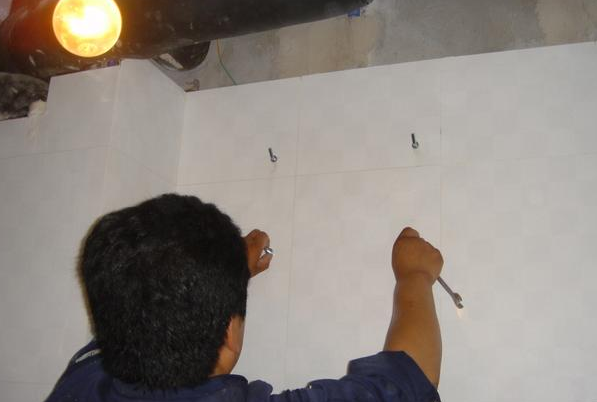 第一步就是量好位置之后做标记,在瓷砖墙上钻孔,放上涨钉。