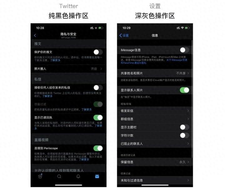 从 Medium 上一位作者 Pudge 给出的对比图来看,在 Twitter 纯黑背景的深色模式下的界面下,通栏列表几乎与背景融为一体了。而 iOS 在深色模式下的这些地方用了稍亮的灰色,感觉更加自然了。
