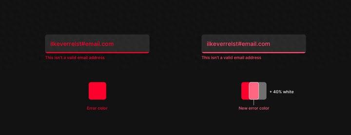 比如很多 app 的品牌色饱和度都比较高,然而高饱和色则是深色模式的大忌之一。正如前文所说,这种对比度十分影响视觉体验,因此必须降低这些颜色的饱和度,Google 的深色模式就会给「错误提示」的红色一层 40% 透明的白色图层。