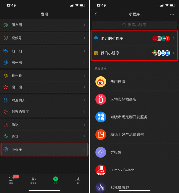 打开微信的深色模式,你也能看到类似的设计。在「朋友圈」、「视频号」、「扫一扫」等可交互的功能栏上,都采用比深灰色背景更亮的灰色。