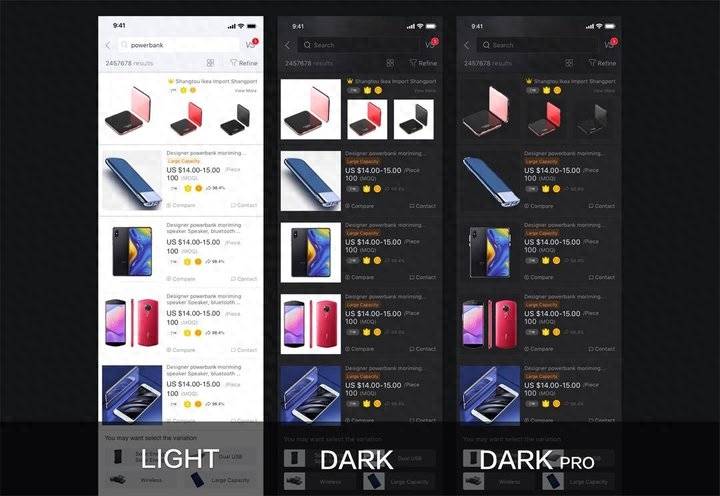这样的问题在很多电商 app 上更显明显,因为大量商品的图片和视频都是以浅色背景为主。如果要只把背景变深色,就会显得十分刺眼。但如果要调整海量的商品图片底色,工作量则十分巨大。