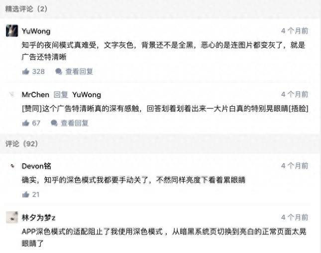 的确,在微信上线深色模式之前,就有一些 app 就推出了深色模式,比如知乎,但这些应用的深色基本沿用了原来的「夜间模式」,体验一言难尽,可以参考下面这些知乎用户的评论。