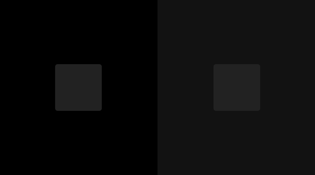 此外纯黑和纯白的高对比度,会让页面无法通过阴影效果来构建视觉层次。比如下图中两个方框中灰色方块,在左侧纯黑的方框中,几乎看不到灰色方块的阴影。而右侧深灰色方框中,阴影的变化则明显得多。