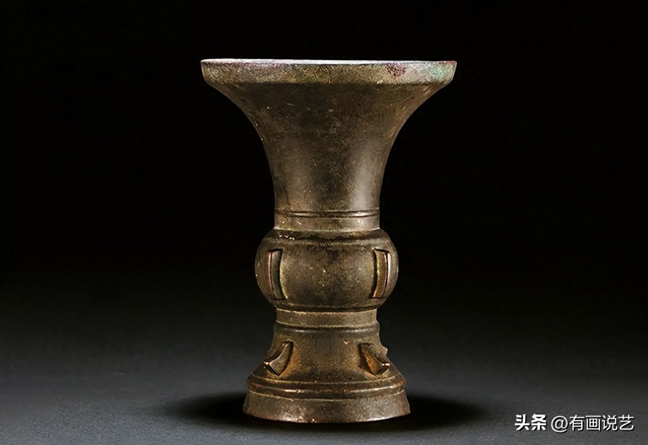 接下来看第三个字,角字旁加一个西瓜的瓜字,这个字念觚gū。觚字还有一种写法,也就是它的异体字“䉉hú”字,只是加了个竹字头。觚,同样和酒有关,也是用来装酒的一种器具,通常都是青铜器,这种酒器长得又高又细,但是开口很大,看上去像一个喇叭,据说可以装两到三升的容量,可见也不是当成酒杯使用,作用大致和觥差不多。