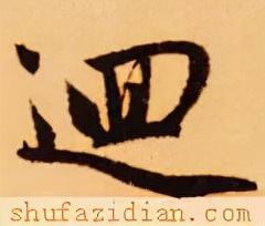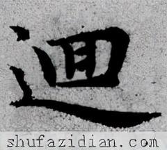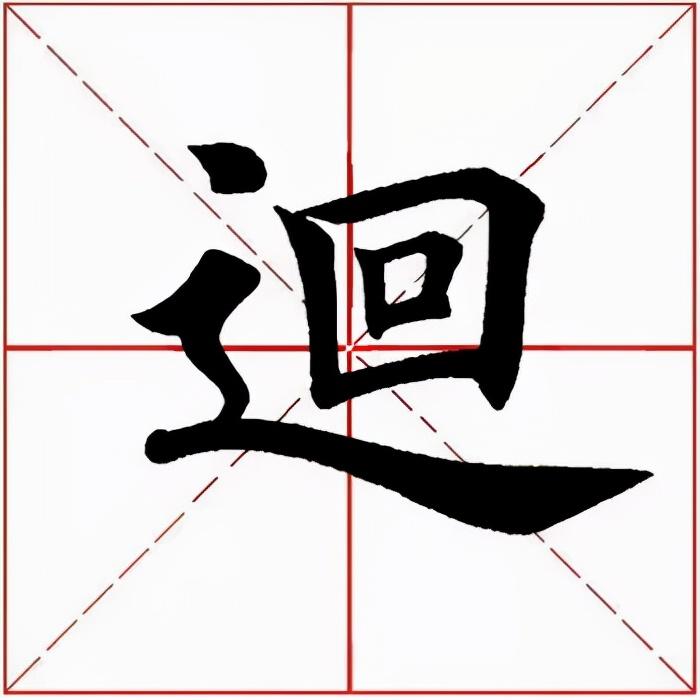 左下部“辶”旁要写准位置。点笔在右上部首笔的左上方,勿大,收笔稍回锋;弯钩起笔要低,横画大抗肩,然后顿笔、回锋走“S”弯,不可大,向下渐轻;最后平捺藏锋起笔,勿重,一波三折,注意行笔的方向和轻重,以及捺脚与上面笔画的对应关系,舒朗飘逸。