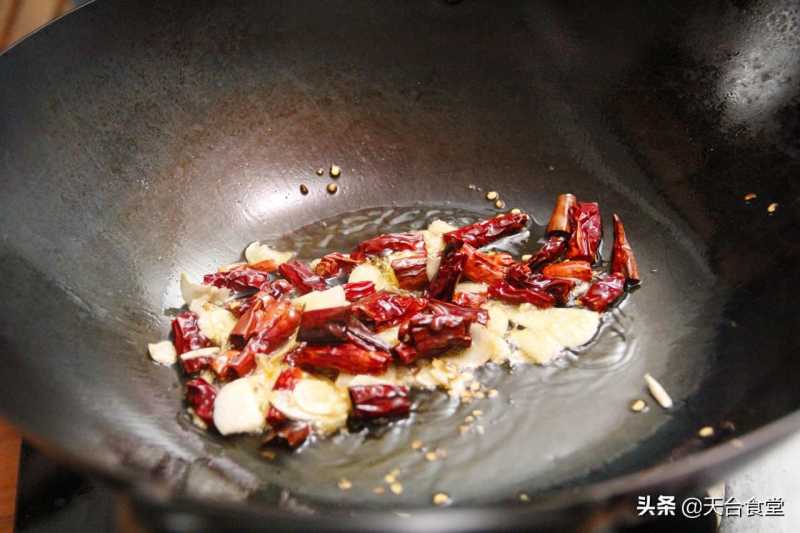 4、 接着,锅内放入食用油,把油烧热后,下入大蒜和干辣椒炒香,把芥菜倒入,翻炒均匀