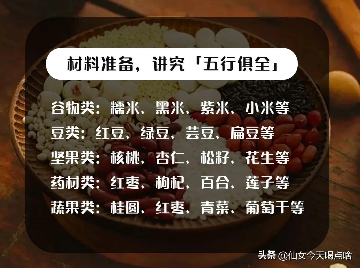 其中有两个关键点,首先是腊八粥的食材没有固定的搭配,而是在分别代表“五行”的谷物类、豆类、坚果类、药材类、蔬果类的五大种类中挑选食材进行搭配。