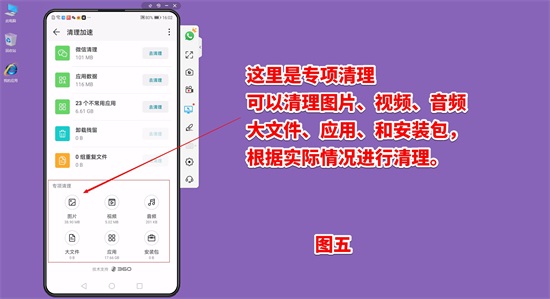 这里的专项清理,可以清理图片、视频、音频、大文件、应用和安装包,具体看图五。