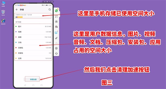 这里是手机存储已使用的空间大小,中间位置是用户数据信息,图片、视频、音频、文档、压缩包、安装包、应用占用的空间大小,然后我们点击清理加速按钮,具体看图三。