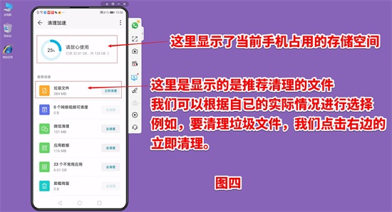 打开清理加速以后,这里显示了当前手机占用的存储空间,中间是推荐清理,我们可以根据自己的实际情况进行选择,例如,要清理垃圾文件,我们点击右边的立即清理就可以了,具体看图四。