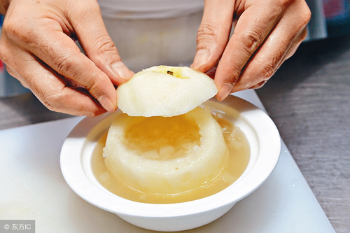 将鸭梨洗净、去皮、去核、切块,置锅中加水煮沸,加入适量冰糖,煮15分钟即可。冰糖蒸梨可以起到滋阴润肺、止咳祛痰的作用。