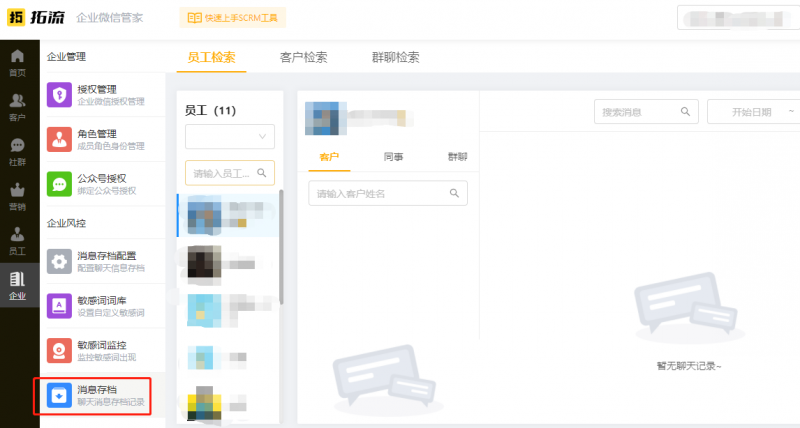 想要永久保存员工和客户的聊天记录,其实还可以用企业微信来服务客户,随时查看记录,这个功能需要企业自行购买开发,大家也可以借助