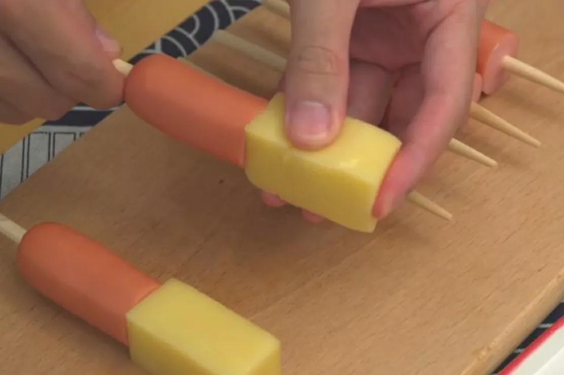 2:芝士也切成像火腿肠大小,喜欢吃芝士的也可以切多一点,把芝士跟火腿肠串到一起。完成之后。