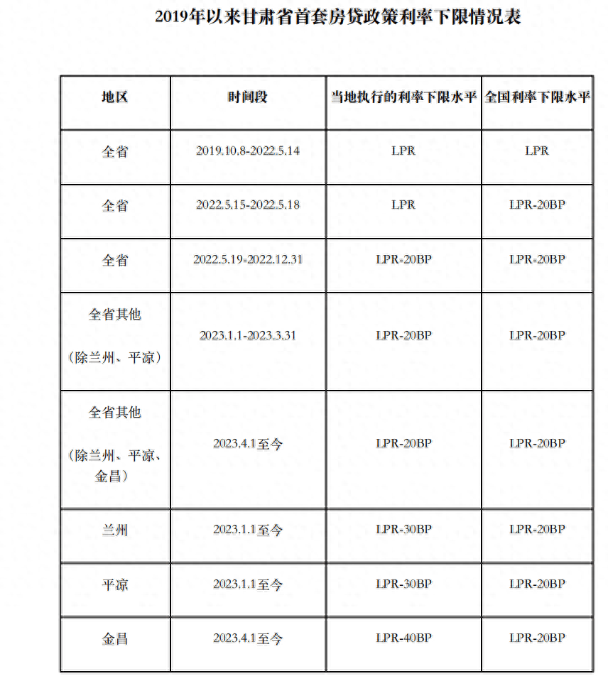 中国人民银行甘肃省分行公布2019年以来甘肃省首套房贷政策利率下限情况表。