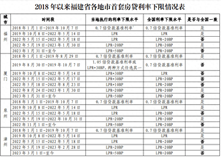 中国人民银行福建省分行公布2018年以来福建省各地市首套房贷利率下限情况表。