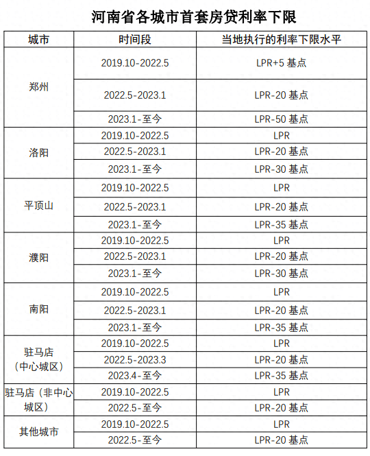中国人民银行河南省分行公布河南省各城市首套房贷利率下限。