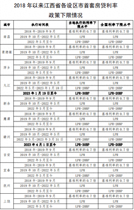 中国人民银行江西省分行公布2018年以来江西省各设区市首套房贷利率政策下限情况。