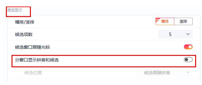 然后打开“分窗口显示拼音和候选”后的开关即可。