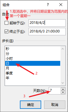 然后在弹出的对话框中,取消“起始于”的选中,并将日期设置为分析范围内的第一个星期一,然后将步长选为“日”,并将天数设置为7