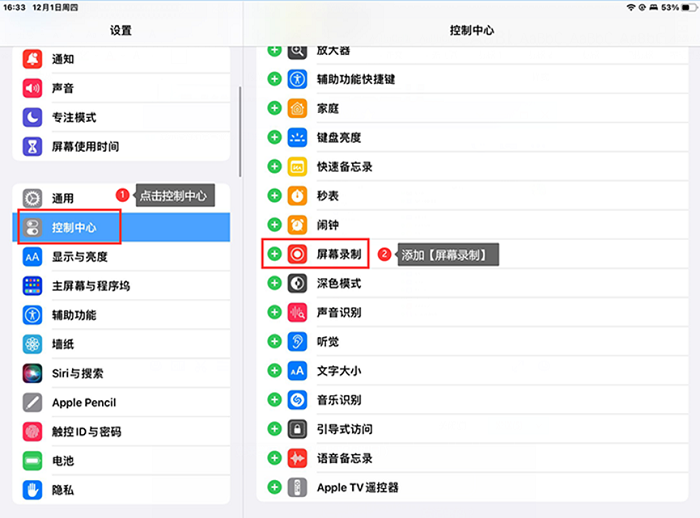 。其实苹果iPad的录屏方法很简单,只需要在控制中心就可以找到了。