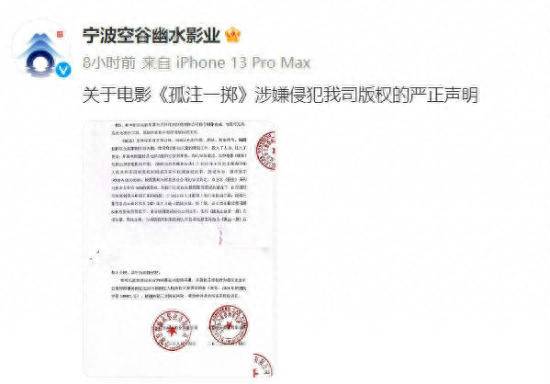 2023年8月17日,宁波空谷幽水影业在微博发布声明称,电影《孤注一掷》涉嫌侵犯其公司原创系列电影《捕鱼行动》的版权,已向国家电影局举报并提起诉讼。