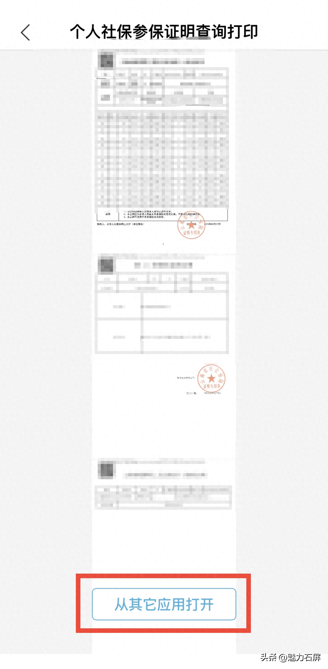 3.输入电子社保卡密码后,等待系统查询完毕,点击“XX社会保险个人社保参保证明”即可查看您的个人社保参保证明。在预览页面中点击“从其他应用打开”,还能将文件发送至微信、QQ等应用中保存。