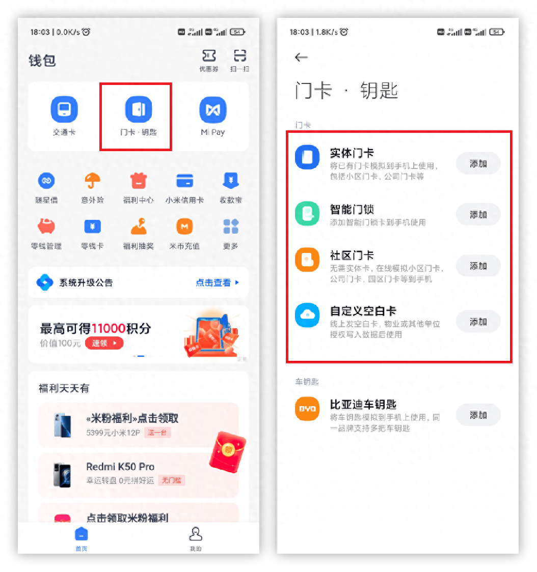 开启之后打开手机上的小米钱包,打开之后我们可以看到首页最上方有三个功能,选择中间的门卡钥匙,点进去之后选择对应的门卡。