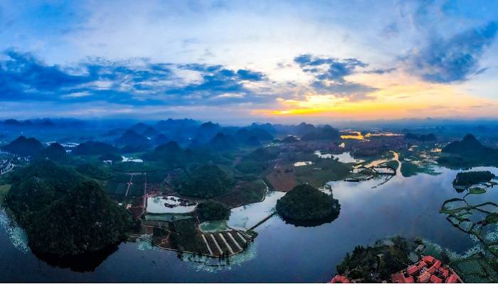 文山州丘北普者黑景区,壮文名称为 Oengz Liuhdoz Lueg Canghngw,音译为”泸尚阁”。其位于云南省文山壮族苗族自治州丘北县境内,距县城13公里,是国家级风景名胜区、国家AAAA级旅游景区。景区总面积388平方公里,核心景区165平方公里,属于滇东南岩溶区,是发育典型的喀斯特岩溶地貌,以”水上田园、湖泊峰林、彝家水乡、岩溶湿地、荷花世界、候鸟天堂”六大景观而著称。