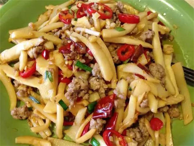 干煸竹笋也是男方经常吃的一道菜。把竹笋洗干净,改刀成细丝,用开水焯烫30秒,切点肉末适量,干辣椒丝,姜丝,葱丝,蒜末,锅里面烧点油,就热以后下点麻椒粒,然后把干辣椒丝等放入锅里面炒出香味,再把肉末下进去继续煸炒,肉末炒干之后放入笋丝,开小火不停的翻炒,直到笋丝炒干炒香,加入适量盐,蚝油,鸡精调味出锅的时候撒上点白芝麻。