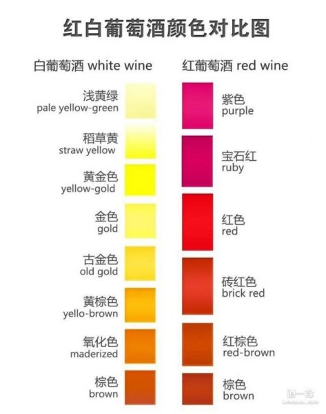 红葡萄酒:朱红,胭脂红,宝石红,深宝石红,紫红,深紫红,暗紫红,瓦红