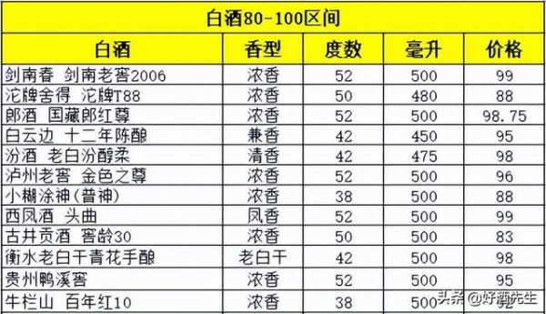 该区间内,剑南春剑南老窖2006、沱牌舍得沱牌T88、郎酒国藏郎红尊、白云边十二年陈酿、汾酒老白汾醇柔、泸州老窖金色之尊、小糊涂神(普神)、西凤酒头曲、古井贡酒窖龄30、衡水老白干青花手酿、贵州鸭溪窖、牛栏山百年红10等。
