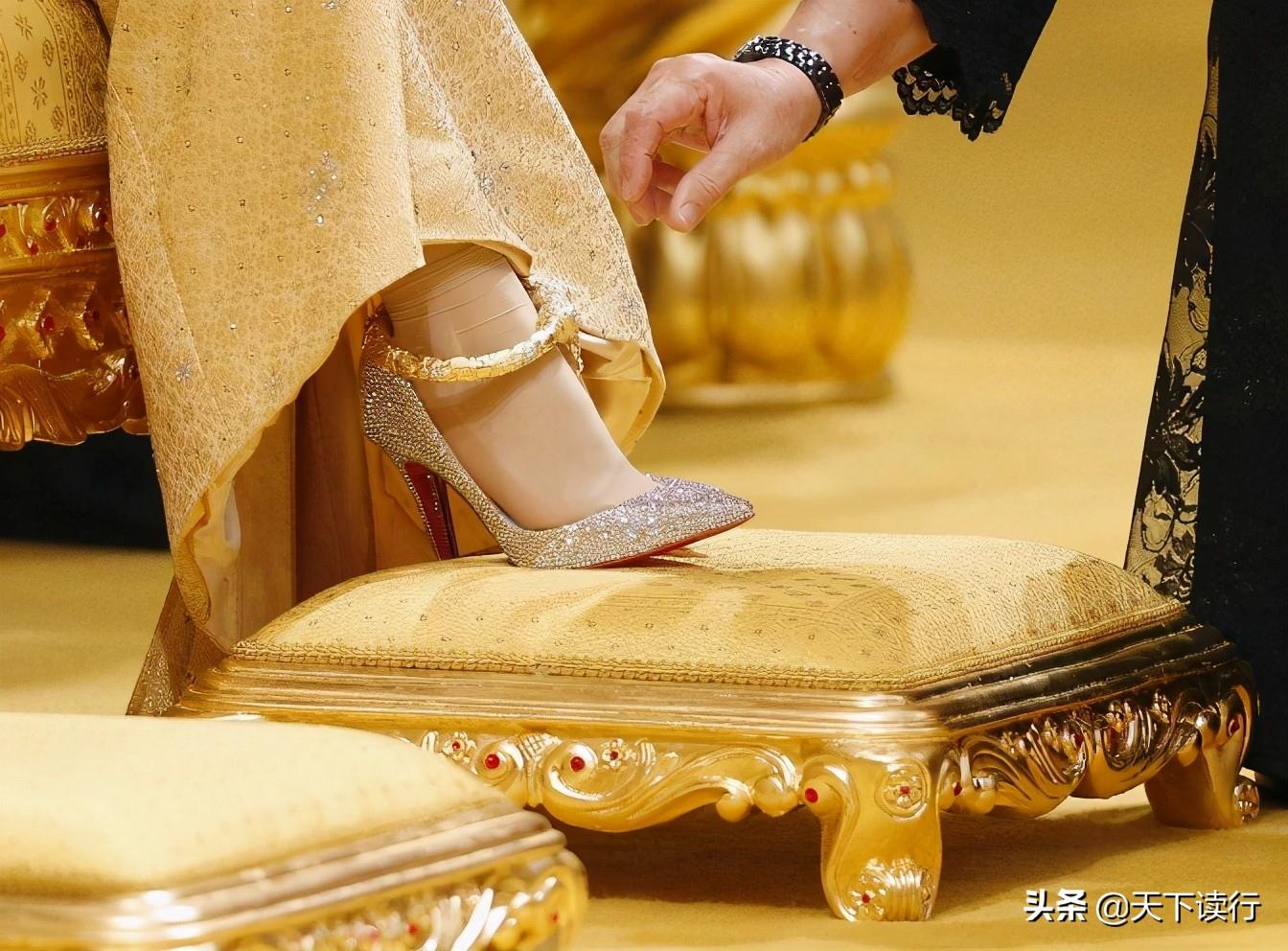 就连新娘那双定制版的高跟鞋上,都镶满了施华洛世奇水晶,非常闪耀。脚踝上还带着一只超大金镯,非常引人注目,真是从头到脚无一不在向人展示财富。