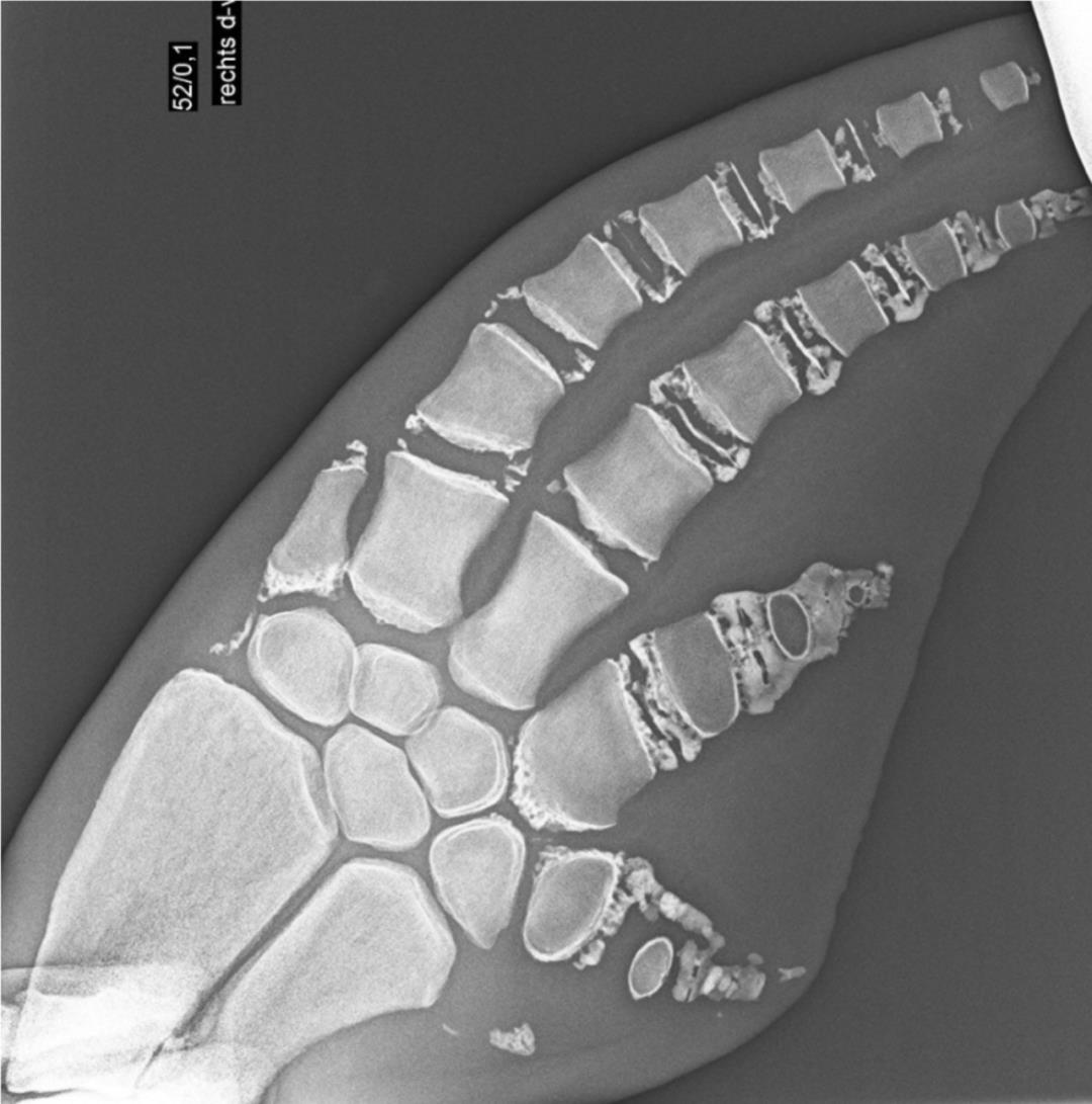 这是X光下的海豚鳍状肢,里面有类似人类手指的骨骼排列,但它们有更多指骨,科学家用这里的骨骼状态来判断海豚年龄(这张图来自一条58岁的雄性海豚)| Barratclough et al., 2019