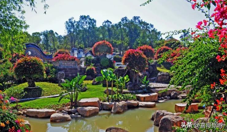 马岭观花植物园景色秀丽,花团锦簇,入口处有大片的稻田和蓝色的风车,园内有三千多亩的美丽花海,置身其中,让人流连忘返,园内的三角梅非常值得一看。