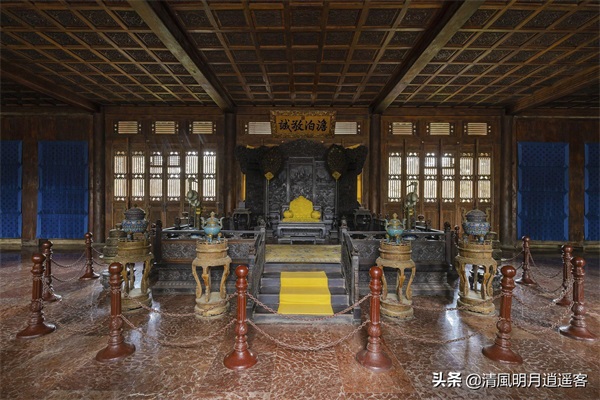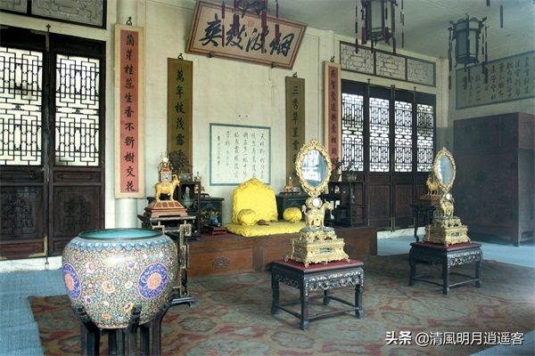 烟波致爽殿,万岁照房北行过门殿,再北有殿七楹,进深两间,名烟波致爽,是正宫后寝部分的主殿,也是清帝在山庄的寝宫。并列为避暑山庄康熙三十六景之首。