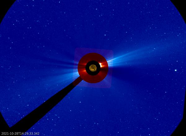 使用白光日冕仪拍摄的“日冕物质抛射”,图片来自:Wikipedia,欧洲航天局