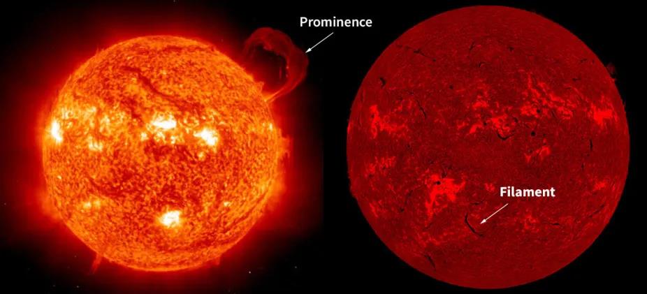 上图中,左边和右边箭头所指的地方,在国内大都统一称呼为日珥,因为两者的结构是相同的。而在一些学术圈,会因为背景的不同而有不同的称呼。