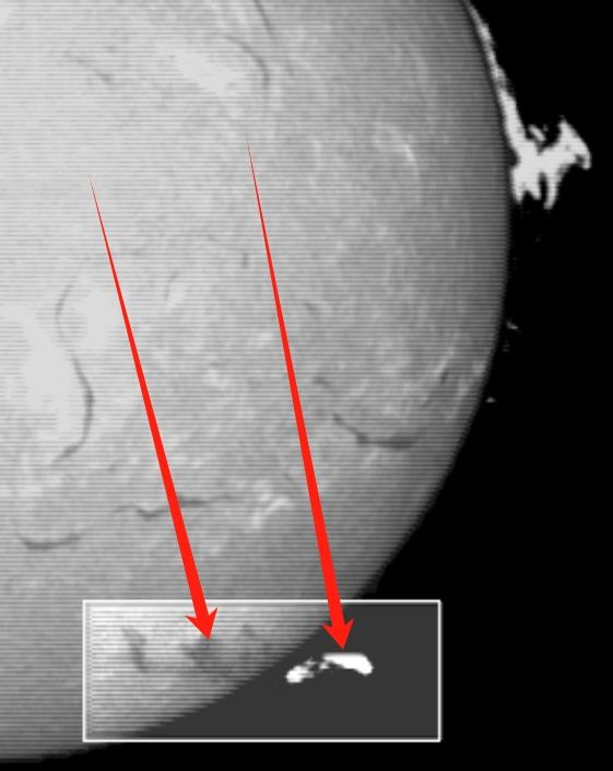 上图下部方框内是日珥的特写,这个日珥其实是一个整体,不同的是,其左边部分是以太阳表面为背景,所以显示为黑色,而右边部分的日珥是以黑暗太空为背景,故而极为明亮。