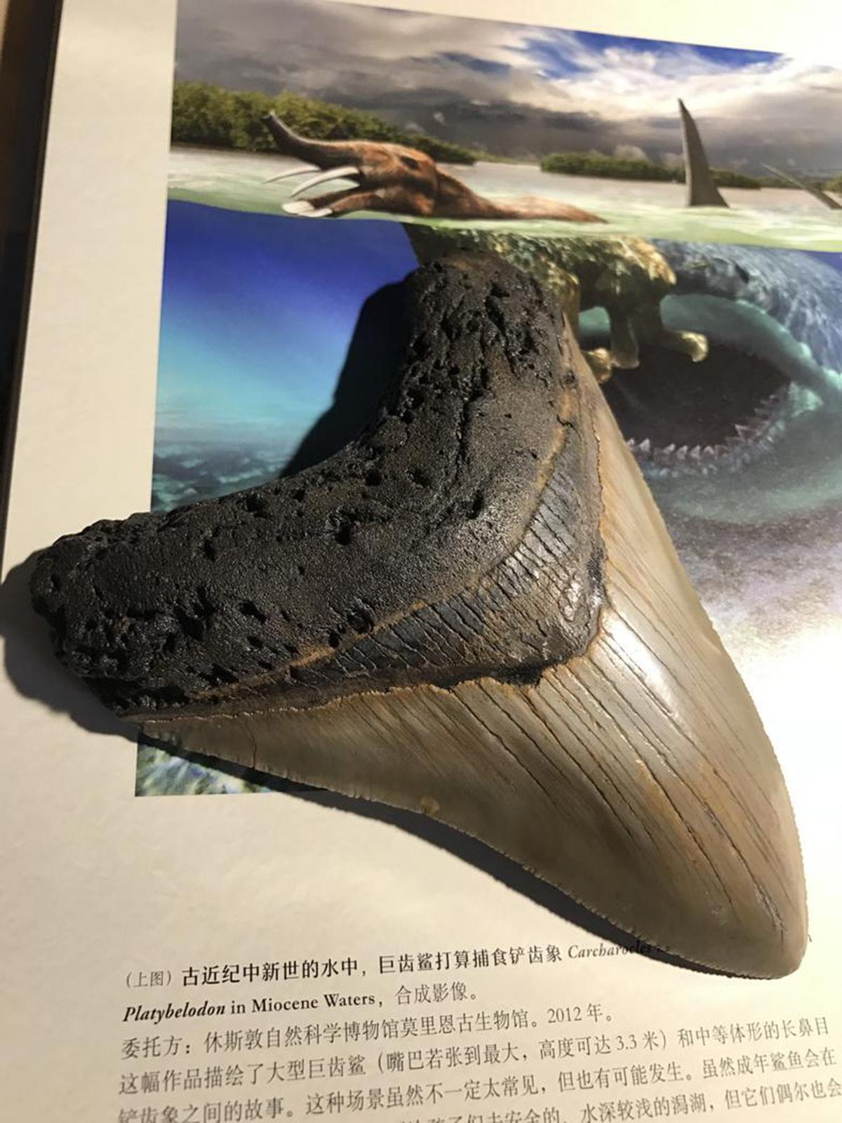 巨齿鲨鱼如其名,它的牙齿非常大,从发掘出来的化石显示,它的牙齿长度接近29厘米,而成年大白鲨的牙齿只有5至10厘米左右,显然巨齿鲨的攻击力不是同时期其他生物可以比拟的。
