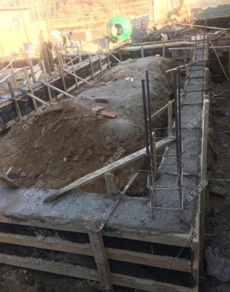 底层铺设10公分厚的混凝土垫层,然后放上14号钢筋的20×20的网格筋,我们这边俗称排子筋,然后再覆盖30公分厚的混凝土。上面用油桶围合作为模板然后浇筑混凝土,两侧用石头墙垒到地梁下平,然后用混凝土浇筑地梁。