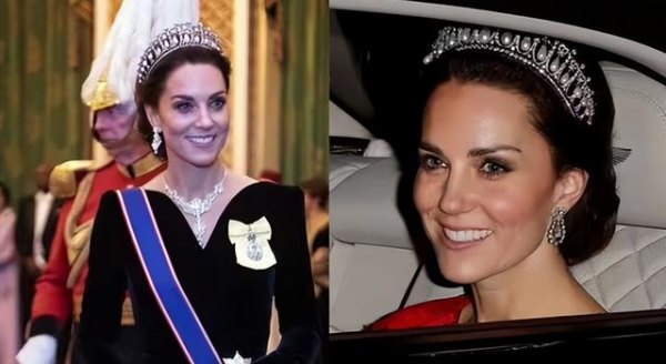 虽然裙子是新的,但凯特并没有像卡米拉那样,在50多顶的王冠收藏里挑选一顶新王冠,仍然是非常恋旧地选择了“剑桥情人结王冠”(Cambridge Lover's Knot tiara)。