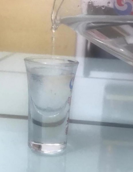 4,兑水,加入白开水后酒液立刻变浑浊,稍后变得比较清澈,仍存在许多絮状物(是纯粮酒该有的特征)。