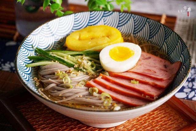 所需食材:荞麦面、黄瓜、火腿、鸡蛋、芒果、葱、蒜、生抽、米醋、蜂蜜、胡椒粉、芝麻、鸡精。