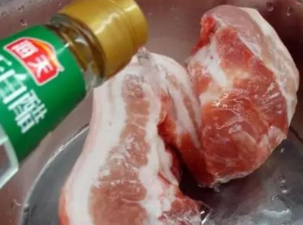 第二步、把冻猪肉放进盆子里,加入一些温水,再加入一勺白醋,用手搅拌均匀,浸泡5分钟。温水为猪肉提供了热量,白醋可以软化猪肉,猪肉就能轻松解冻了。