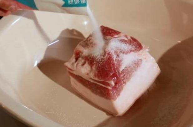 第一步、在冻猪肉上撒一些食盐,用手揉搓1分钟,然后等待5分钟。食盐可以降低水的冰点,冻猪肉抹盐后冰会快速溶化,解冻速度加快。