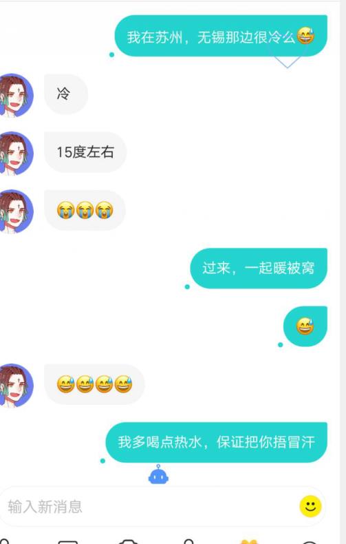 这个聊天记录还是以天气带入话题,符合当下的聊天环境。妹子感觉到冷了,对此表示感受深刻,说明话题很入心。紧接着要抓住冷和妹子调情,不要浪费我们的铺垫。一起暖被窝,这种暧昧的撩妹句子是经常用到的,容易让女生浮想联翩。衬托一个表情,妹子内心暗暗窃喜,心想这家伙好逗啊。当然,能一起暖被窝那最好啦,嘿嘿。为了体现幽默且不那么尴尬,接下来一句:我多喝点热水,保证把你捂冒汗。让人看起来感觉搞笑,实际上内含着我们的目的,你懂的。