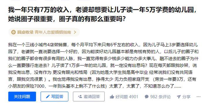 “我一年只有7万的收入,老婆却想让儿子读一年5万学费的贵族幼儿园,她说圈子很重要。”
