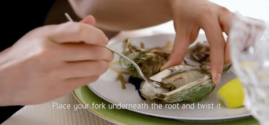 一定要先把叉子放在肉下面,挪一下生蚝的根,与此同时还不能把嘴带到碟子上。