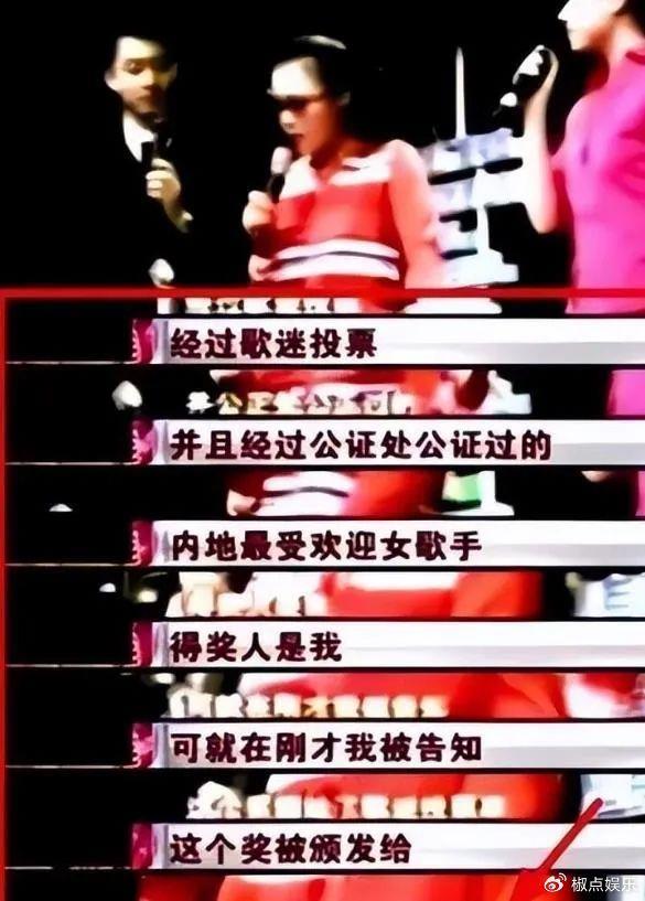 田震当场发飙了,直接走到领奖台上夺过话筒,毫不留情地揭开了当晚的黑幕:经过歌迷们的几轮投票,自己才是最受欢迎的女歌手,如今这个奖项却颁给第二名。